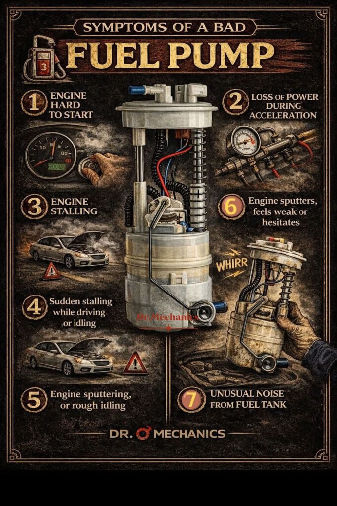 The fuel pump is responsible for delivering fuel from the tank to the engine at the correct pressure. When the fuel pump begins to fail, the engine may not receive enough fuel, which can lead to several noticeable performance problems.One of the most common symptoms is difficulty starting the engine. A weak fuel pump may struggle to build the required fuel pressure, causing the engine to crank longer before starting. Another sign is loss of power during acceleration, especially when driving uphill or carrying heavy loads. The engine may feel weak or hesitate because it is not receiving enough fuel.A failing fuel pump can also cause engine stalling. The vehicle may suddenly shut off while driving or when idling due to an inconsistent fuel supply. In addition, the engine may experience misfires or rough running, as low fuel pressure prevents proper combustion inside the cylinders.Another noticeable symptom is unusual noise coming from the fuel tank. A worn fuel pump may produce a whining or humming sound as it struggles to operate.If these symptoms appear, it is important to inspect the fuel system quickly. Ignoring a failing fuel pump can lead to poor engine performance, reduced fuel efficiency, and eventually complete engine shutdown. Regular maintenance and timely replacement help ensure reliable engine operation. 🚗🔧